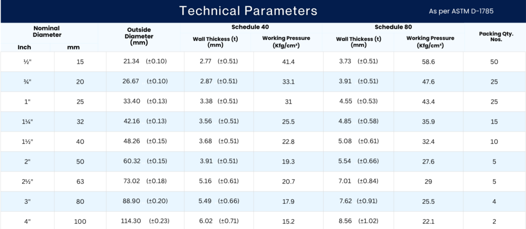 These pipes are widely used for cold water supply lines, drainage systems, overhead tank connections, and rainwater management. They are suitable for residential, commercial, and industrial applications where hot water is not required.